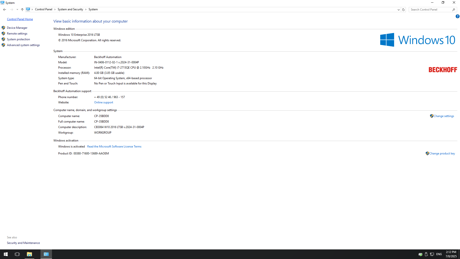 - 128GB CFast with Beckhoff Windows 10 LTSB 2016 installed and automatically activated