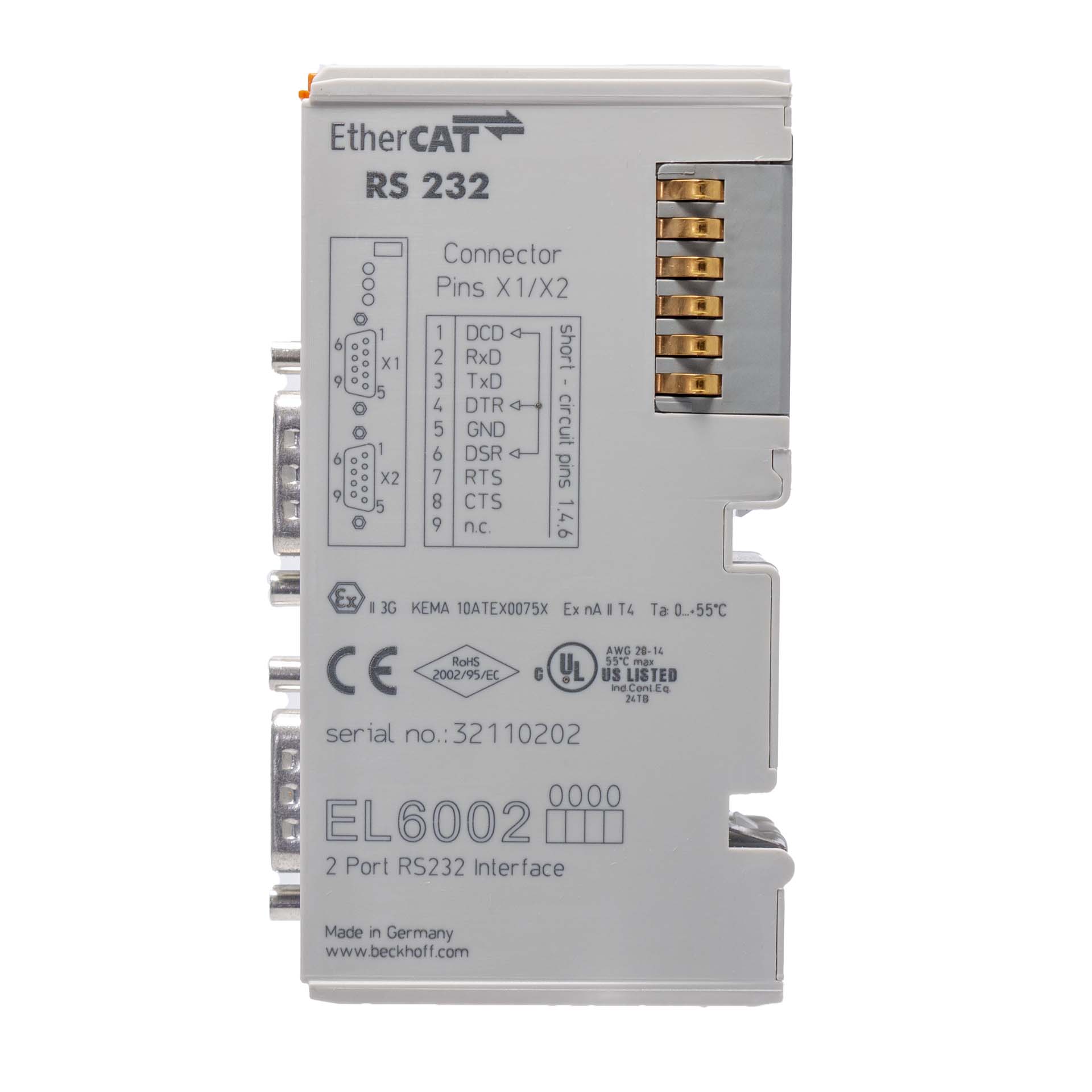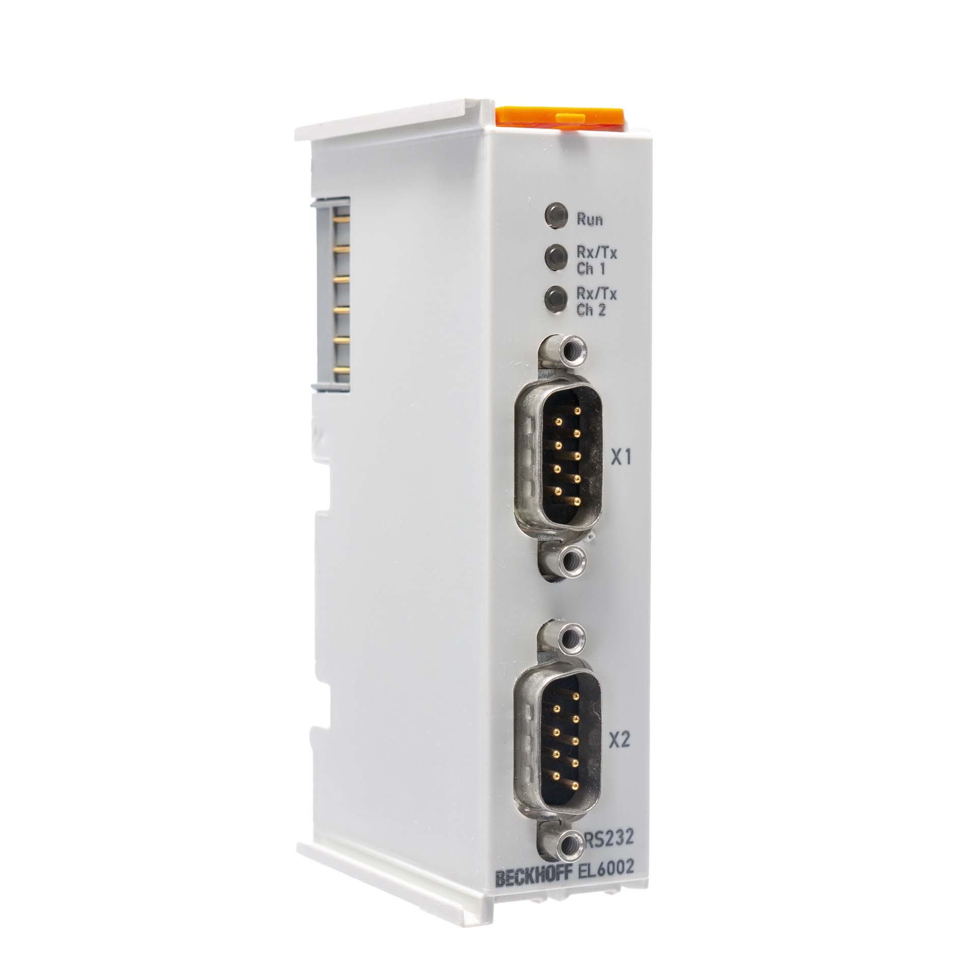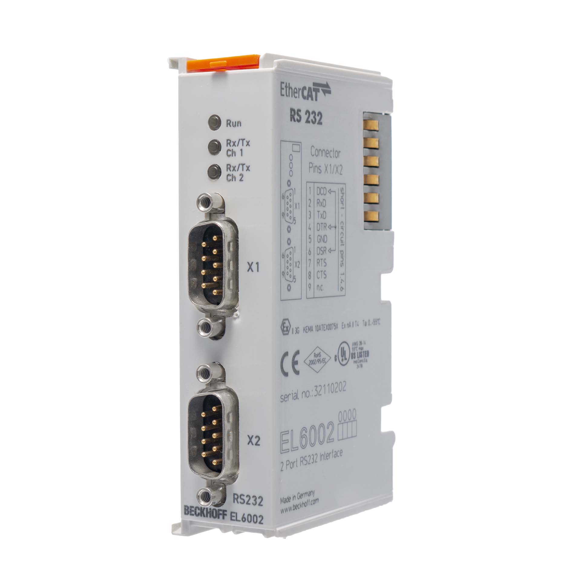 The EL6002 serial interface enables the connection of devices with two RS232 interfaces. The devices connected to the EL6002 EtherCAT Terminal communicate with the automation device via the Coupler. The active communication channel operates independently of the higher-level EtherCAT system in full duplex mode with 300 baud up to 115.2 kbaud. The RS232 interfaces guarantee high interference immunity through electrically isolated signals.