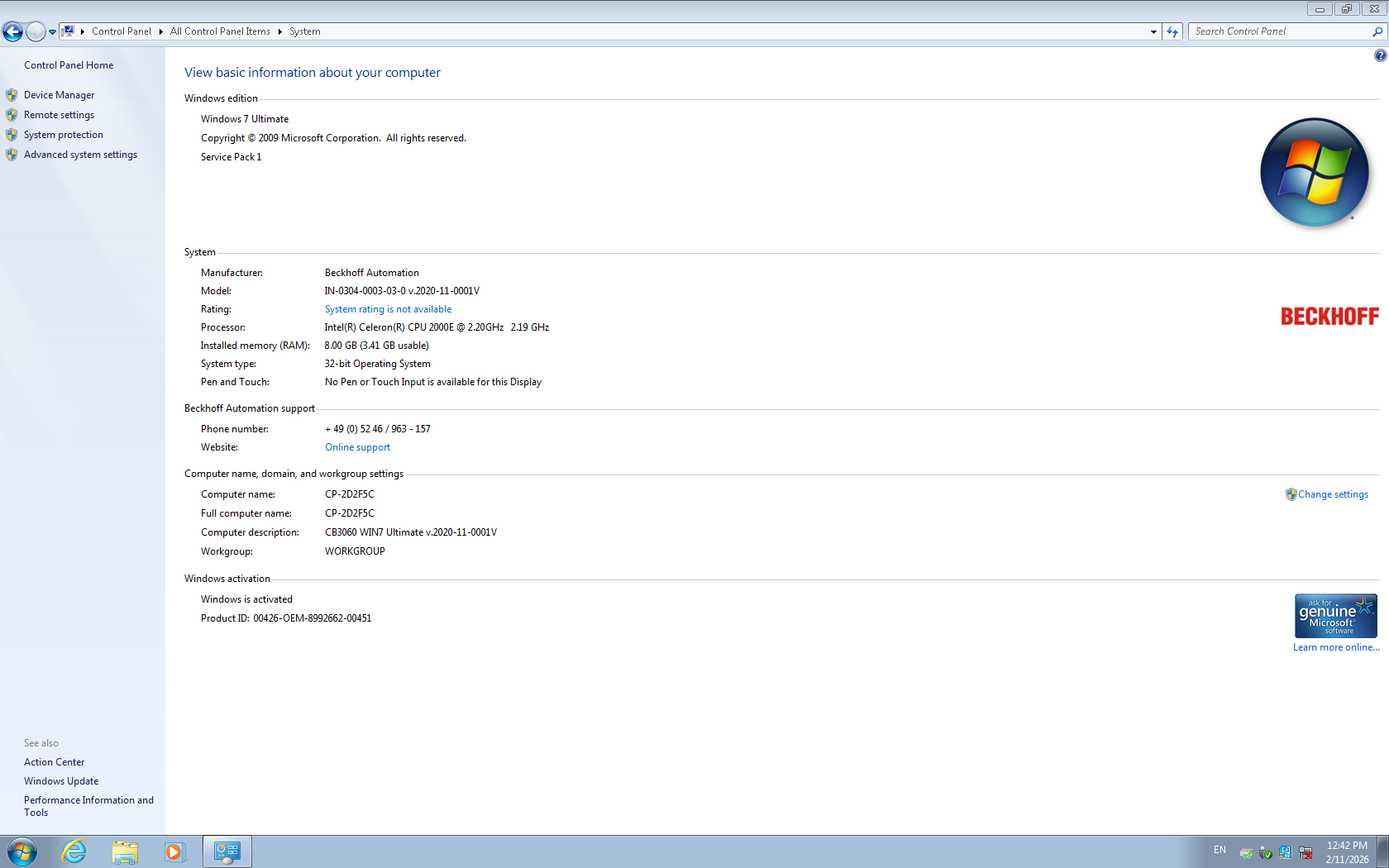 - Fresh install Windows 7 Ultimate EMB from Beckhoff with Sticker