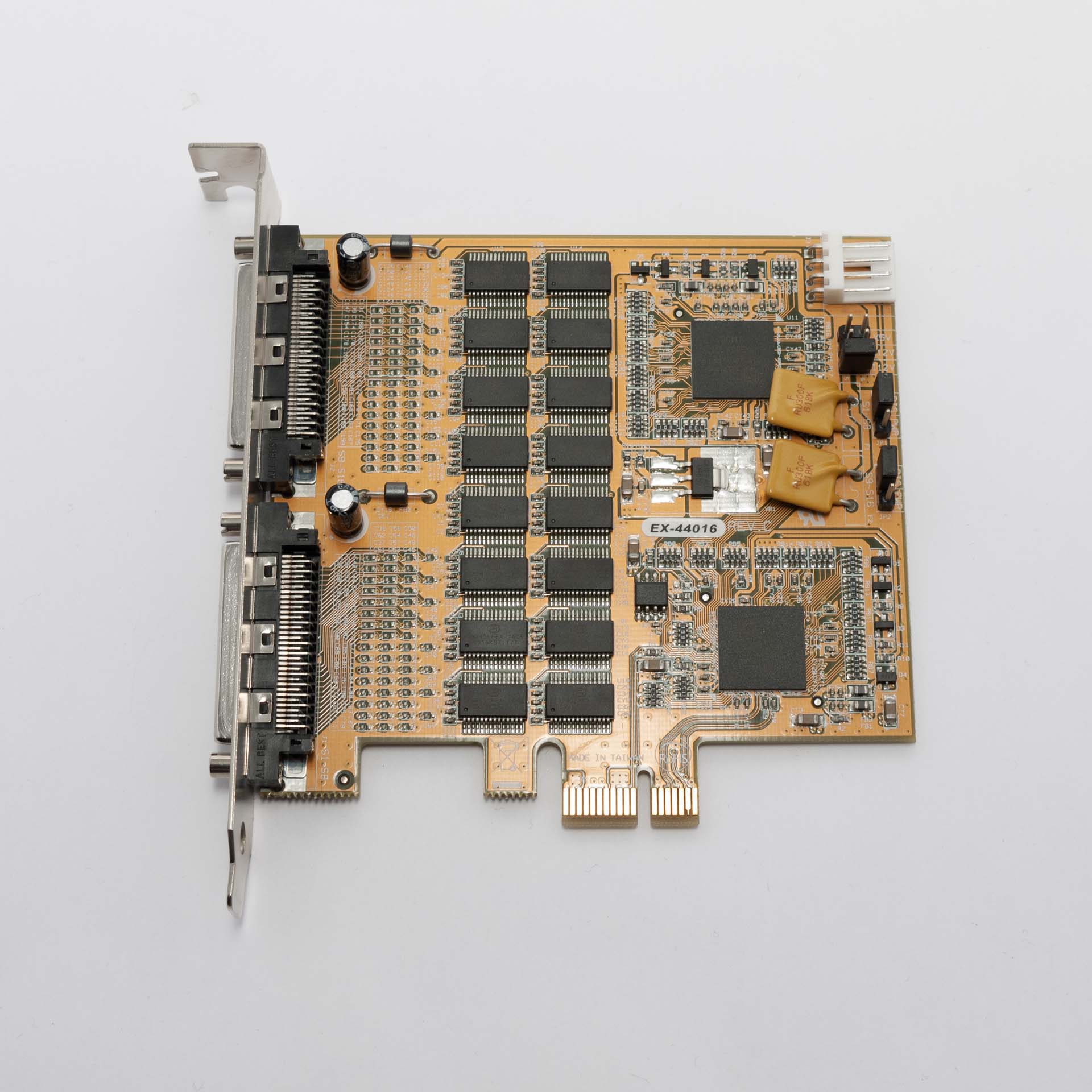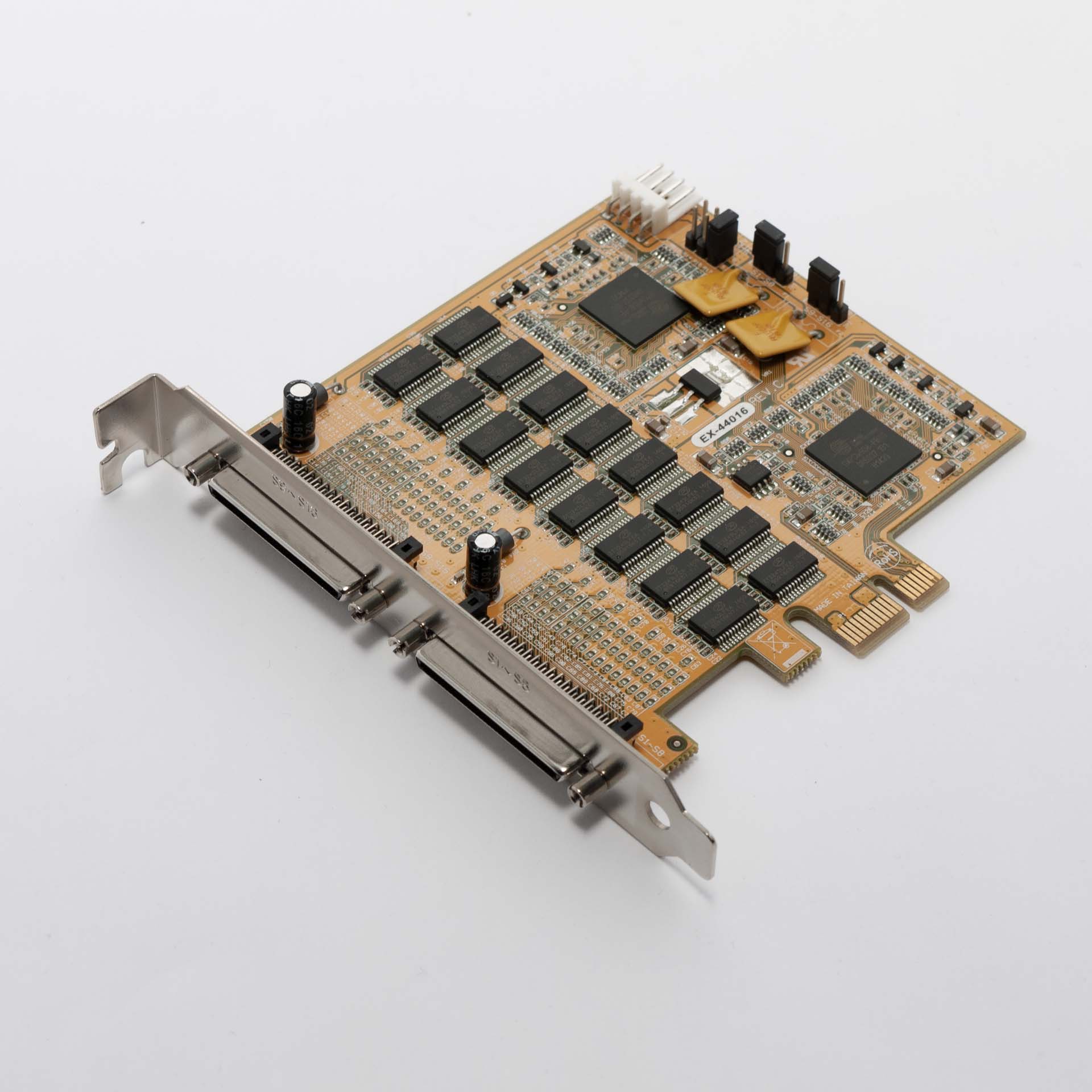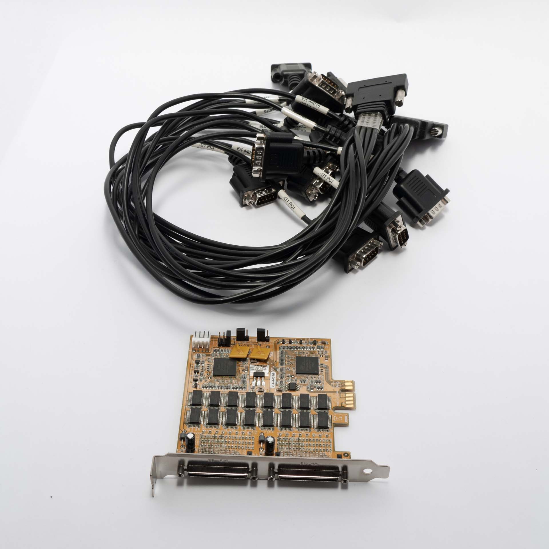 The Exsys EX-44016 Rev. C is a high-density PCI-Express x1 expansion card designed to provide sixteen RS-232 V.24 serial ports to desktop computers, servers, and industrial systems. Ideal for complex automation and data acquisition setups, the card efficiently manages multiple serial connections through two on-board 68-pin connectors and comes included with the necessary breakout octopus cables.