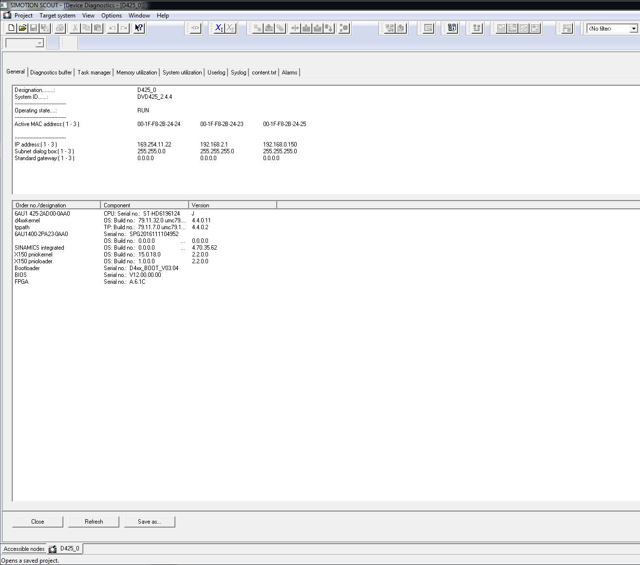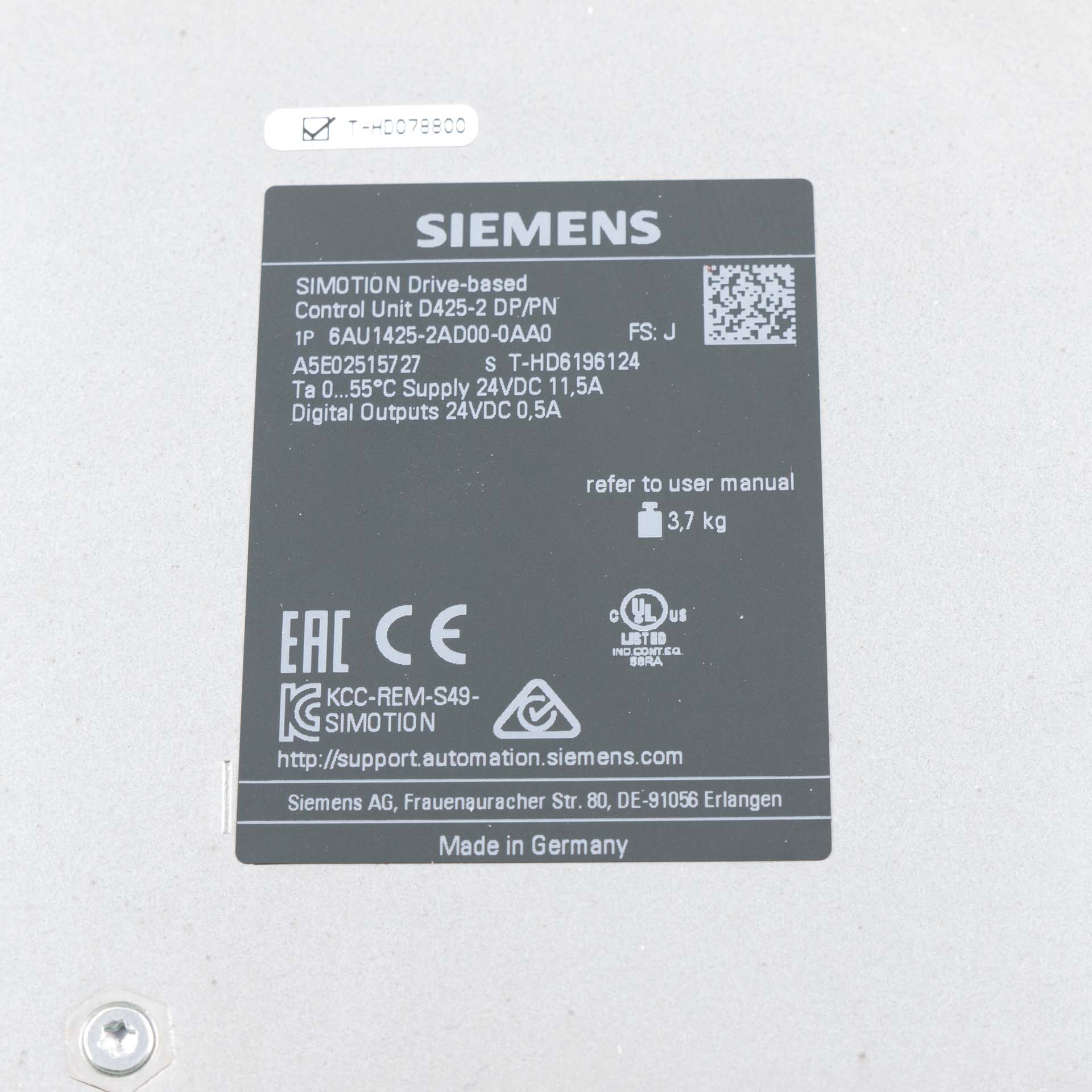 - Control Unit: Siemens SIMOTION D425-2 DP/PN (Part No. 6AU1425-2AD00-0AA0)